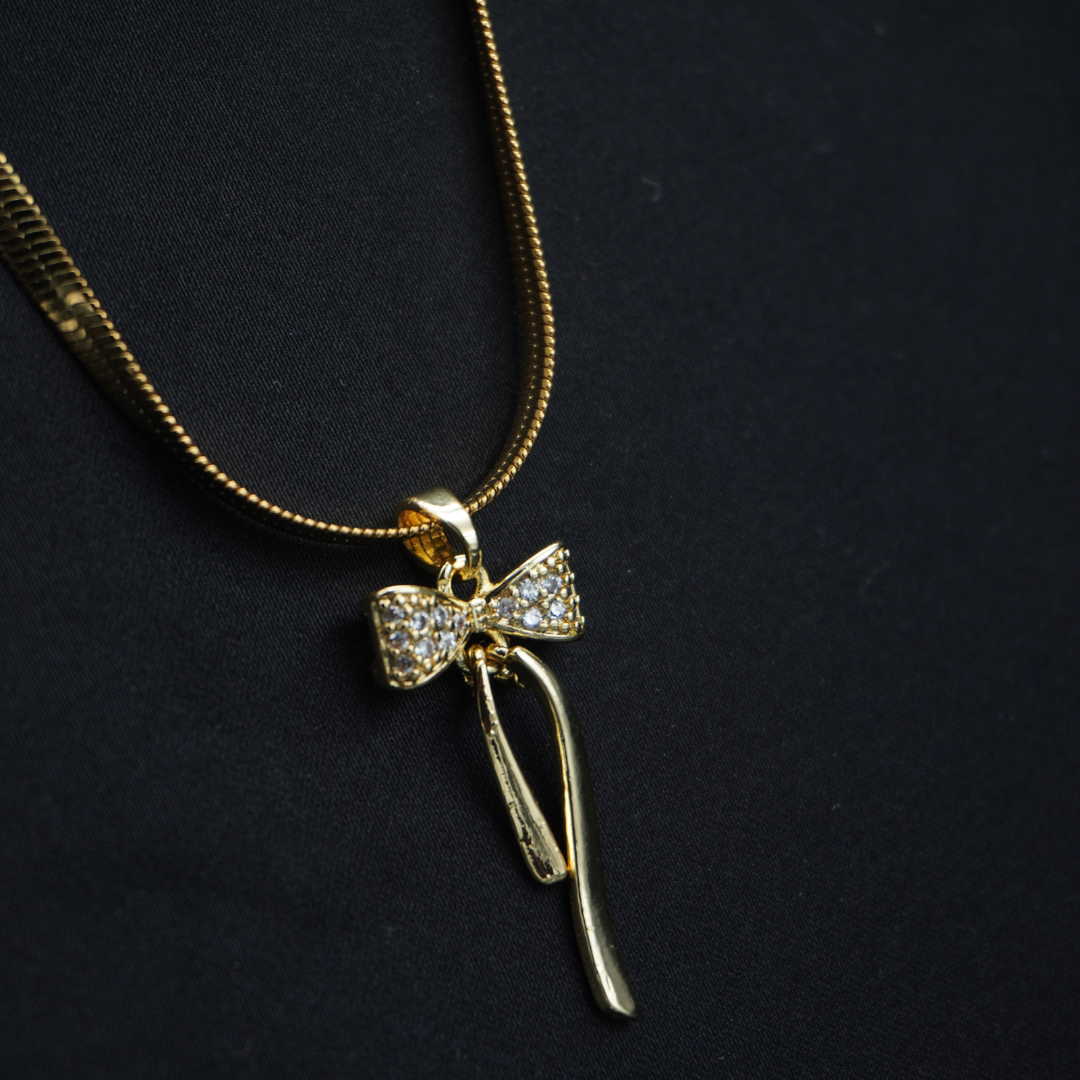 This Gold Plated American Diamond Bowtie Necklace exudes elegance with a modern twist. Crafted with 18k gold plating over high-quality stainless steel, it features a stunning bowtie design studded with American diamonds that add a touch of sparkle. The anti-tarnish finish ensures long-lasting beauty, making it perfect for everyday wear. With its minimalist and trendy design, the bowtie is a stylish accessory that enhances any outfit. High-quality, timeless, and on-trend, this necklace is an essential addition to your daily jewelry collection.