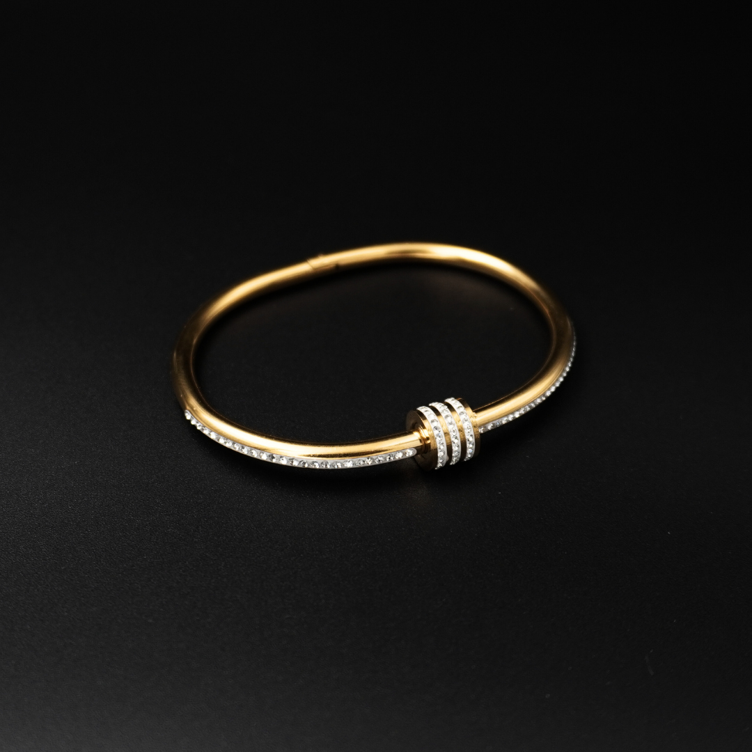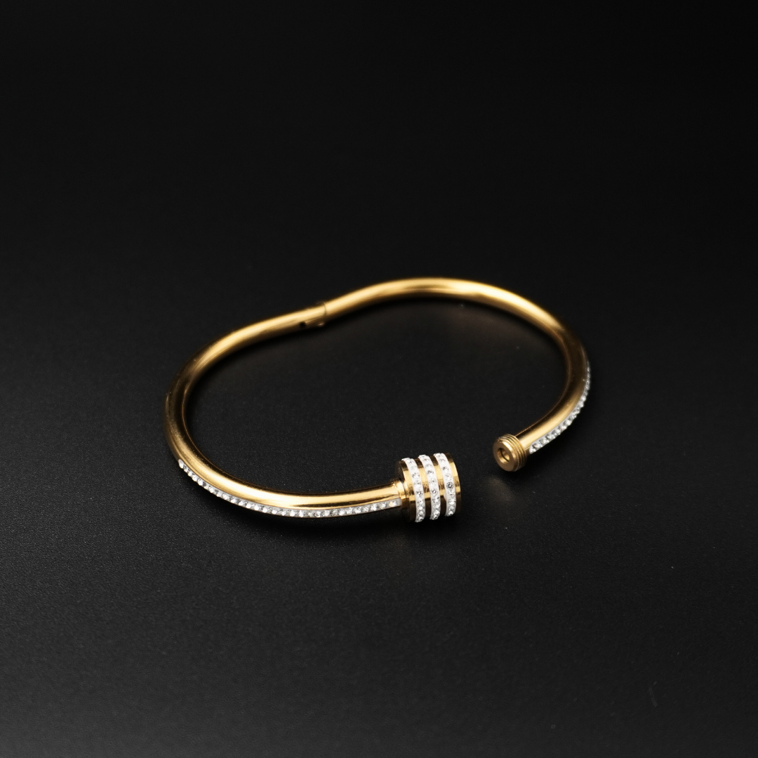 The American Studded Diamond Bracelet is a stunning fusion of luxury and durability. Crafted with high-quality silver and 18k gold coatings, this bracelet features a unique design adorned with dazzling American diamonds that add a brilliant sparkle. Its anti-tarnish and waterproof properties ensure long-lasting beauty, while the adjustable fit makes it perfect for any wrist size. Available in three elegant colors—gold, rose gold, and silver—this bracelet is versatile enough to complement any style. Whether worn alone or stacked, it’s a timeless accessory that exudes sophistication and charm.