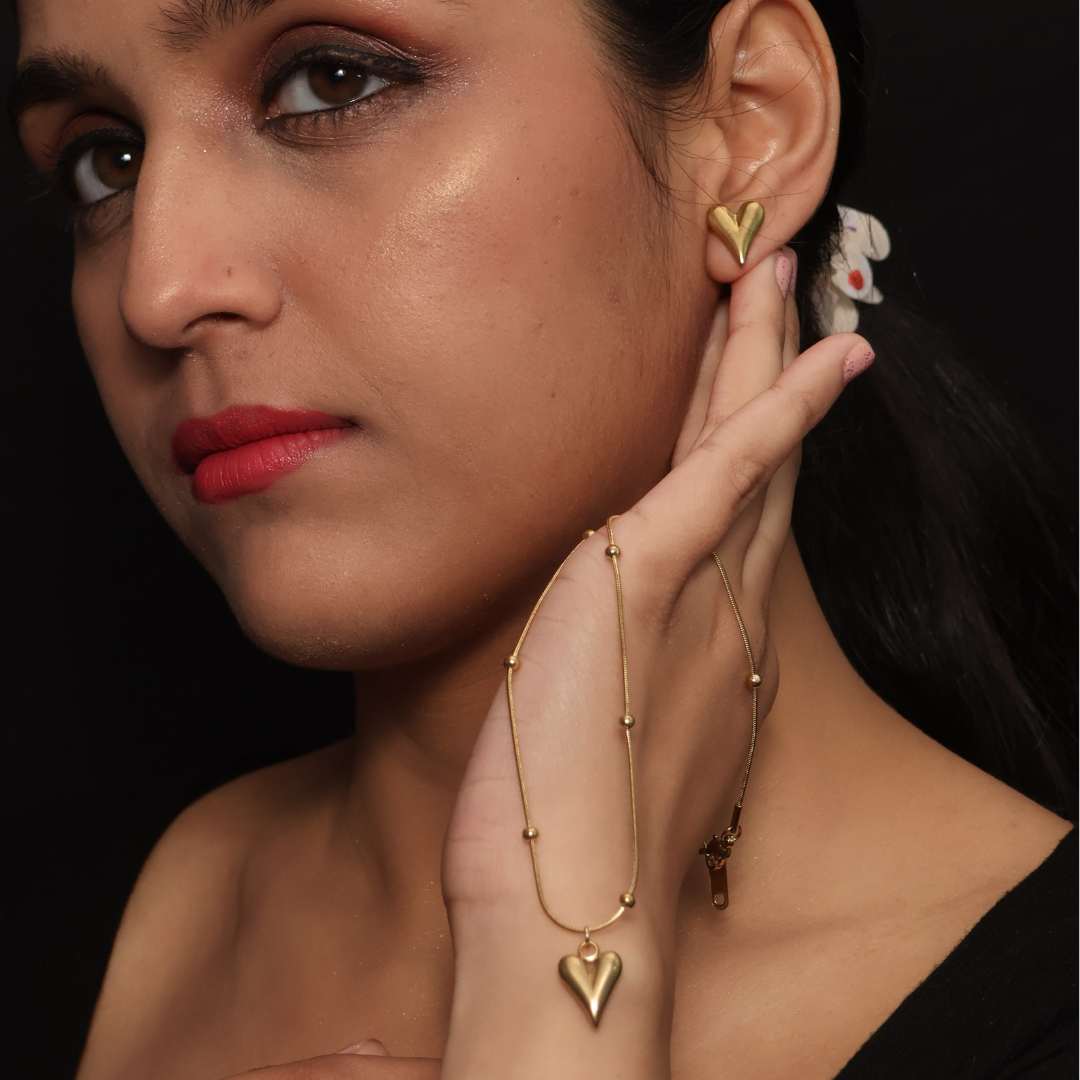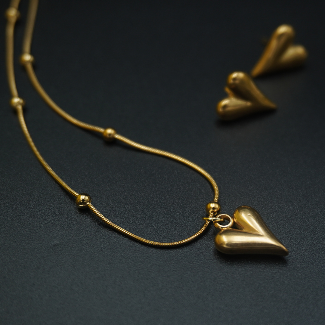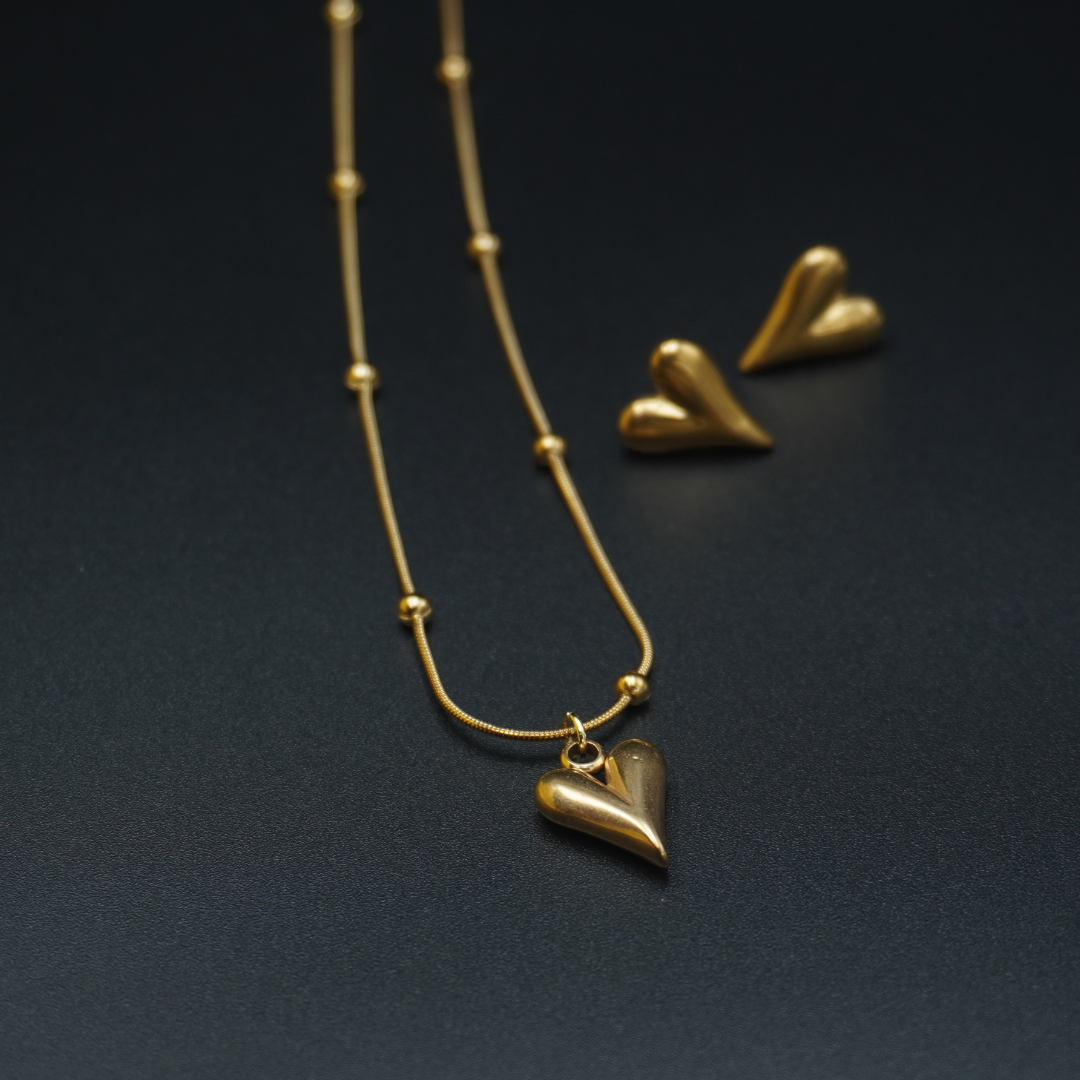Gold Plated Minimal Heart Earrings Necklace Pendant Set